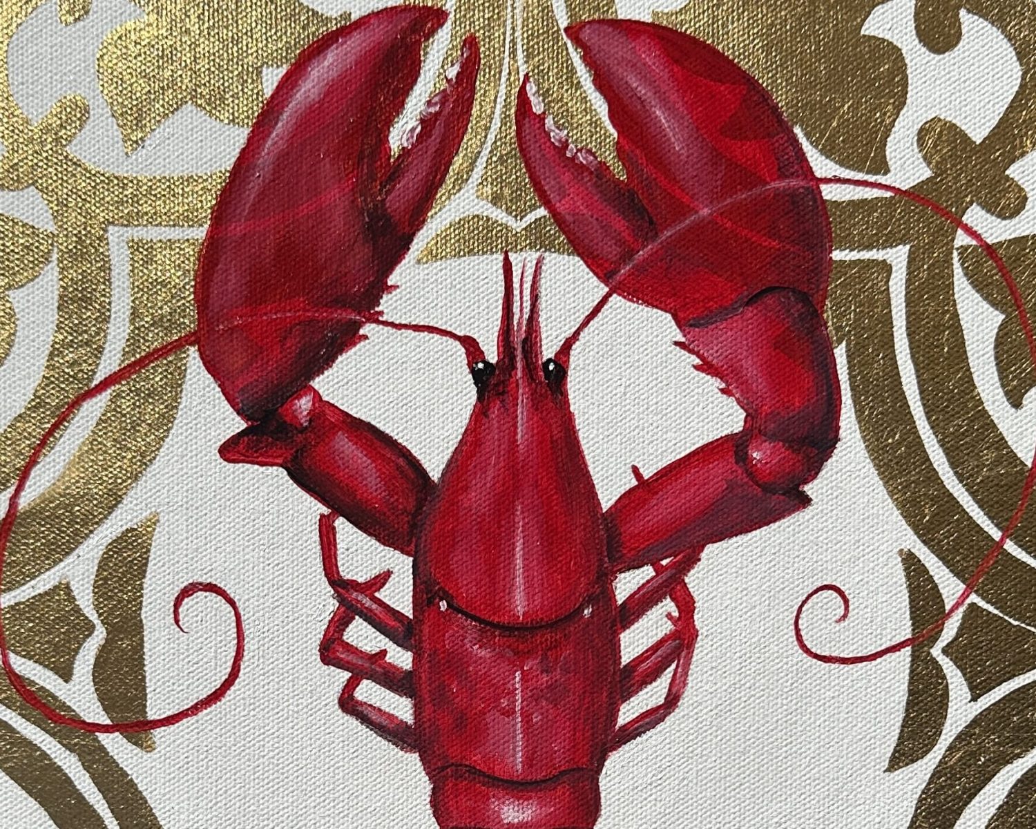 Pop inspired and full of quirky fun — “The Elegant Crustacean” is a fun-sized original painting by Mel Bling at our Terrigal Art Gallery. Measuring 30x30cm (approx. 11.8 x 11.8 inches), this acrylic and gold leaf painting combines a striking pop-red lobster with luxe gold leaf details and design.