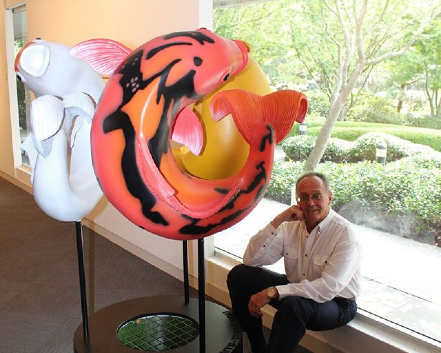 Throughout 2015, the Gosford Regional Gallery sought expressions of interest from artists to put forward a creation or concept for a unique artwork. The gallery needed something special that would inspire and encourage visitor donations. Central Coast en plein air artist Graham Austin OAM was the selected artist and a 1.5m tall resin reproduction of his creative concept is now a permanent feature of the Gosford Regional Gallery foyer. It is a Koi G donation wishing well and encourages visitors to donate coins when they visit.