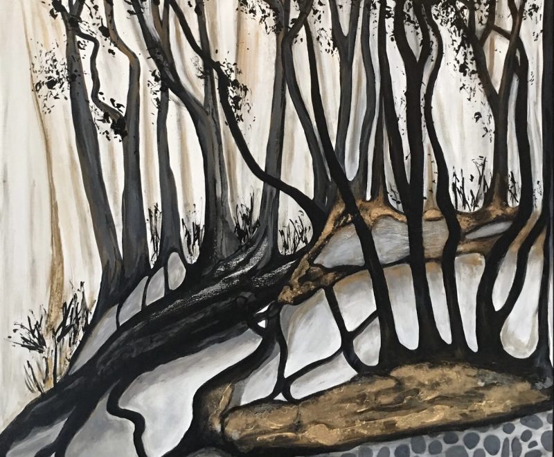 A series of works by local artist Elaine Foulsham features striking accents of gold, complimenting the organic shapes of the landscape, and echo the raw minerals found in nature. Not only do we see the use of warm neutral greys and browns used to compliment each other promote a sense of harmony in the home.