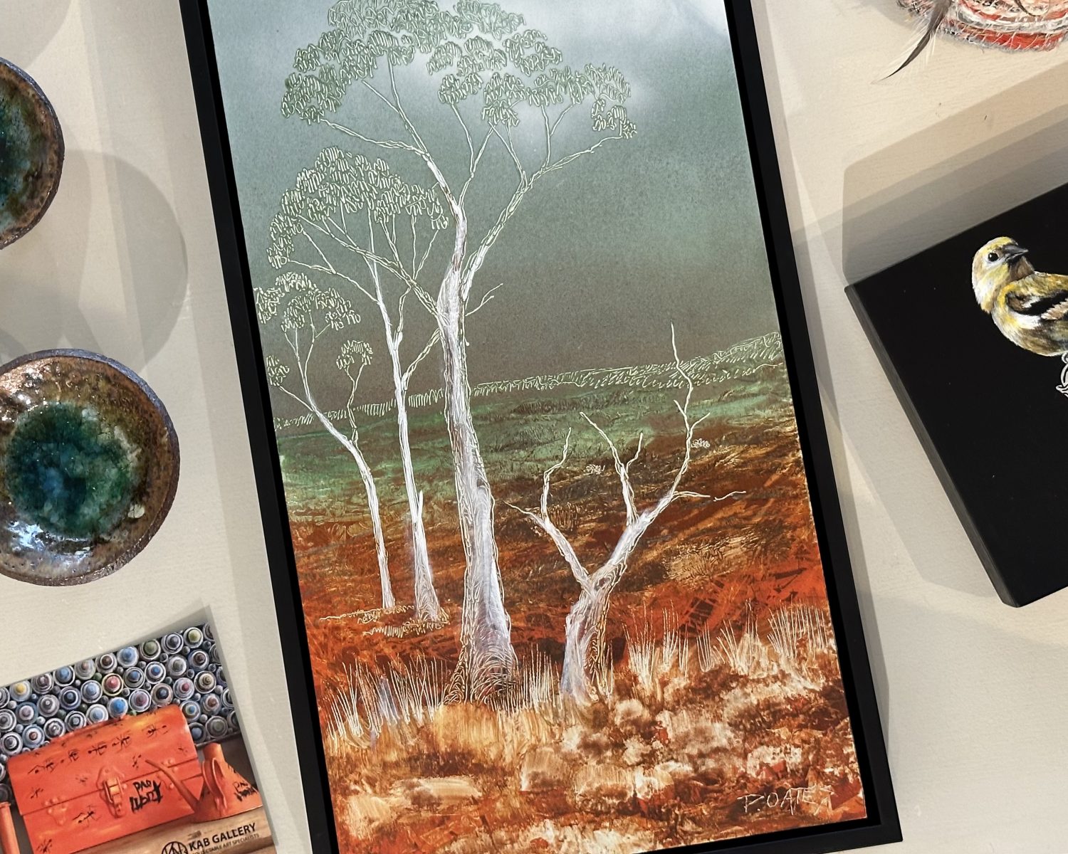 ‘Ready for Rain‘ reflects Penelope Oates’ mystical connection to the rural landscape and her appreciation for the serene yet precarious character of the outback. The painting is framed in a contemporary black frame which adds a striking contrast with the piece.