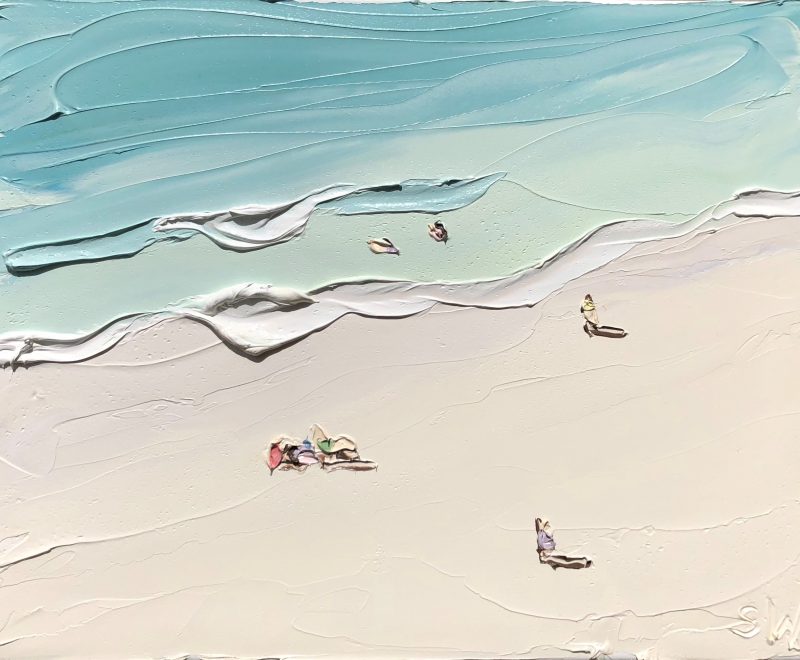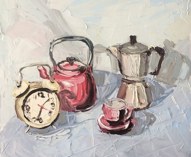 Lastly, a feature work in our gallery window, is a piece by Sally West. Our gallery is a view point for many of our neighbouring cafe visitors. This painting is one that has been catching their eye while they finish up their own tea and coffee. A beautifully textured still life, seen here photographed in natural light – it comes ready to hang.