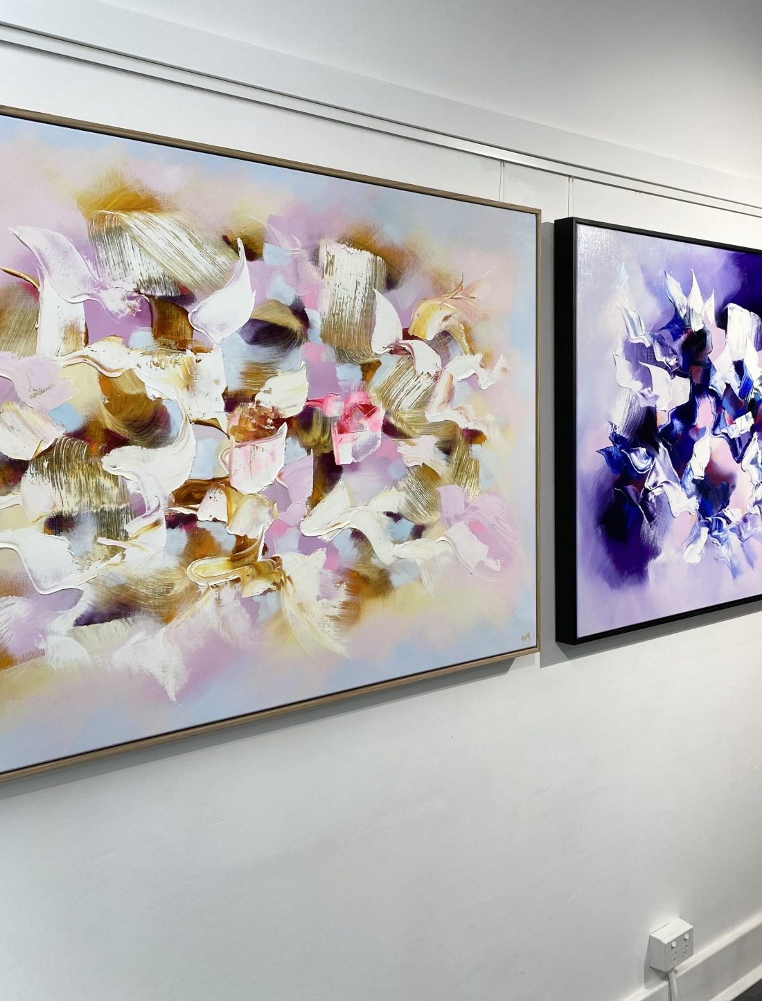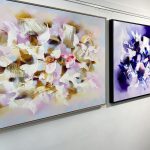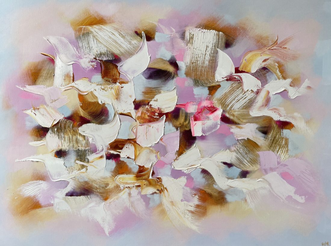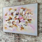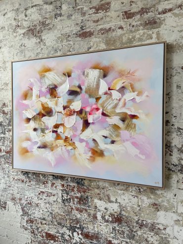 Original painting by abstract artist Catherine Hiller, featuring a beautiful pale blue and blush palette and lux finish. Part of the her solo exhibition “Délices d’Eden” at KAB Gallery Sydney.