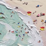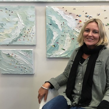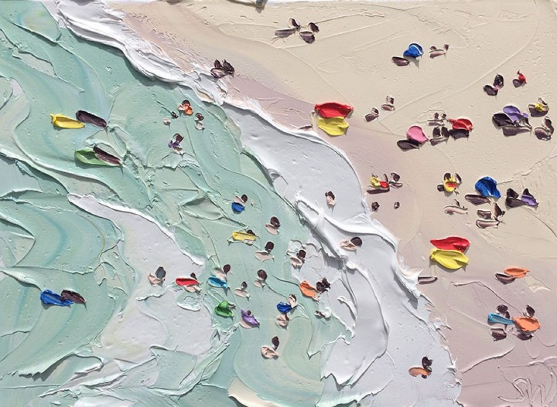 Sally has found a particular position high up on a rock platform, giving her the perfect aerial perspective to paint while overlooking the surfers and swimmers. She fondly refers to this place as her “hot-rock” as it’s best to visit on sweltering summer days when the water is blue and there are lots of beachgoers to paint. Over the past few summers Sally has been working on an entire series of works based on this spectacular view. She says “I love painting the view, it’s constantly changing”.