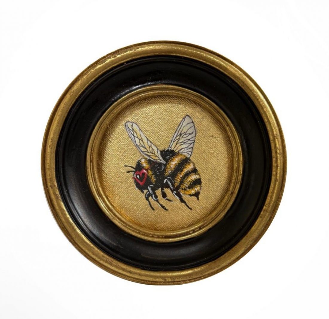 Round artwork presented in an ornate style round frame. The artwork is suitable to stand on a shelf or be hung on the wall.
