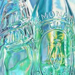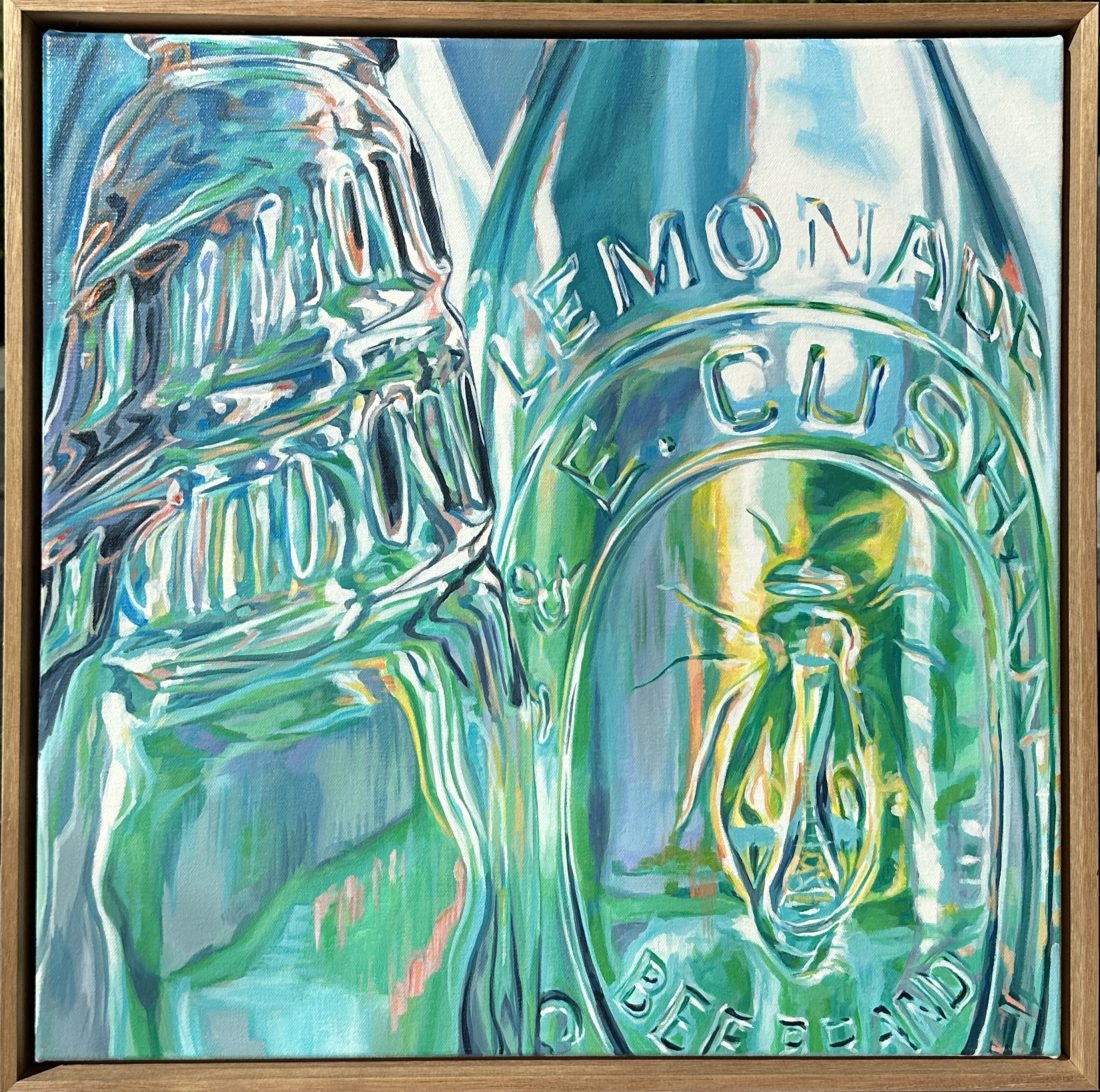 Much like her water-inspired series, McEwen’s attention is drawn to the way light filters through transparent surfaces. In Bees Knees, the bottles shimmer with shifting tones as colour bends, reflects and overlaps. Subtle highlights and shadows create depth, while the bee motif adds a touch of charm and individuality.