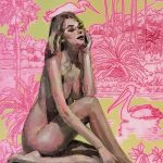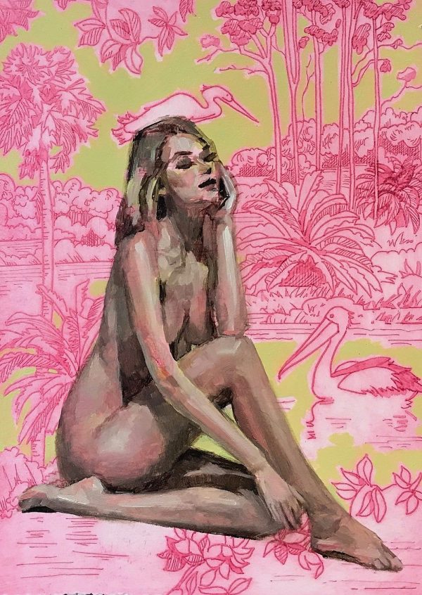 This artwork is two works in one. The background was created to look like a vintage fabric sample. It was made using a solar etching depicting an original a toile de jouy scene of Sydney’s Northern beaches. The foreground was painted in oils.