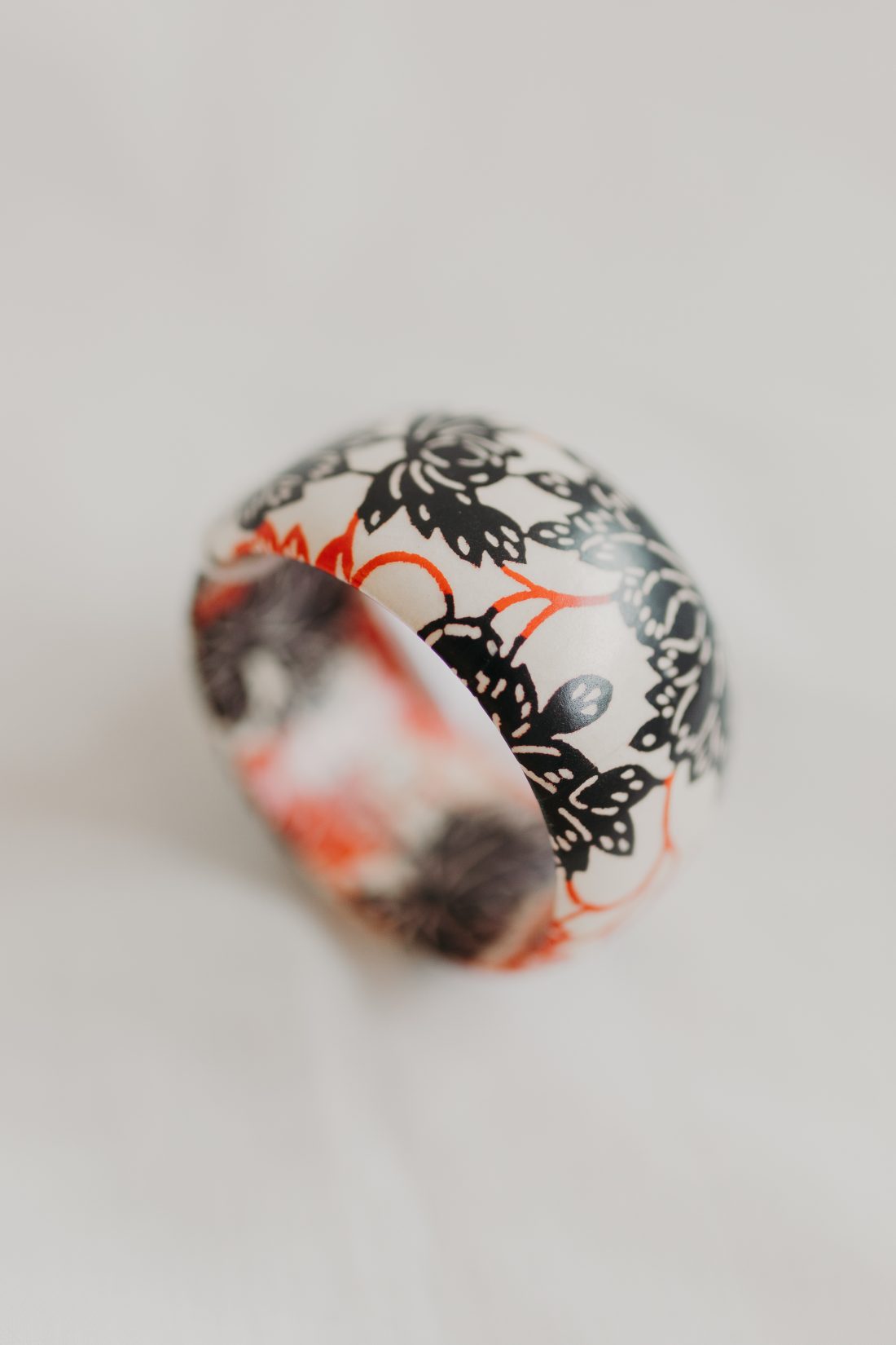 A handcrafted bangle made out of wood from sustainable sources and decorated with beautiful designs using the traditional 18th century art of decoupage.