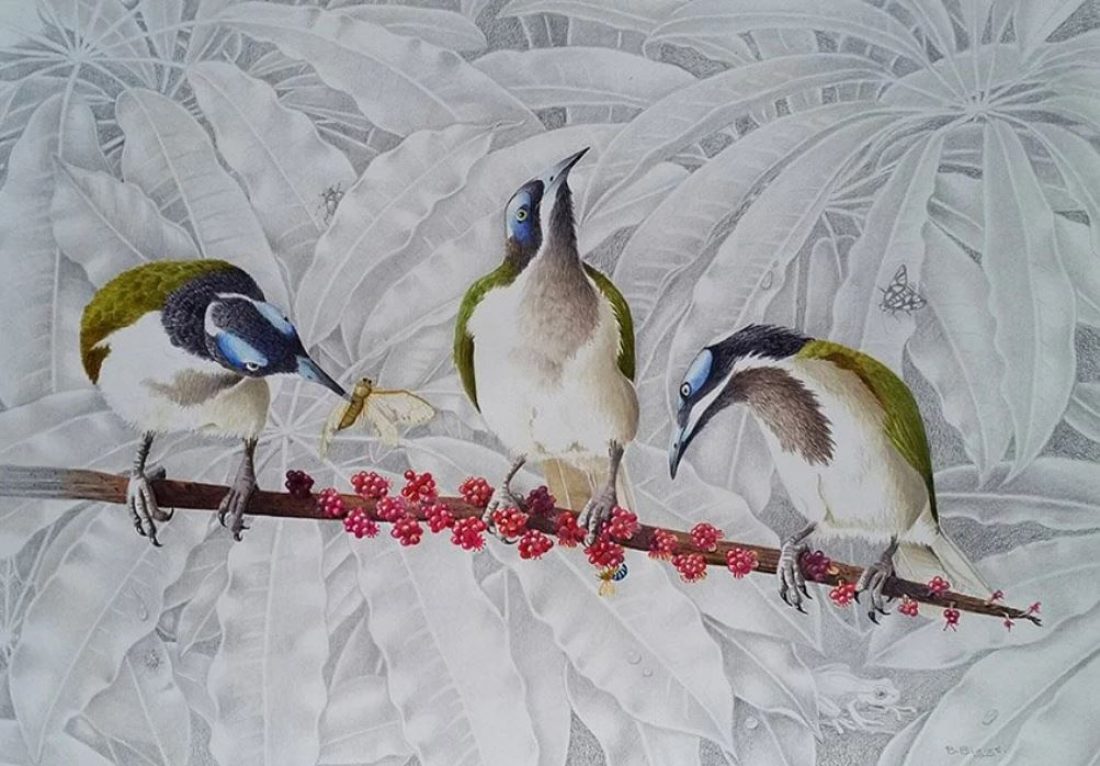“I was lucky enough to see these Blue Faced Honeyeaters in the Wollombi Valley, NSW. The twisting of the necks is a characteristic movement of the birds. Although called honeyeaters, their main food source are insects. If you look closely I have made up a story – the first bird on the left has its food, the second on is looking up and missing the action below, the third one is eyeing up what the second one is missing!