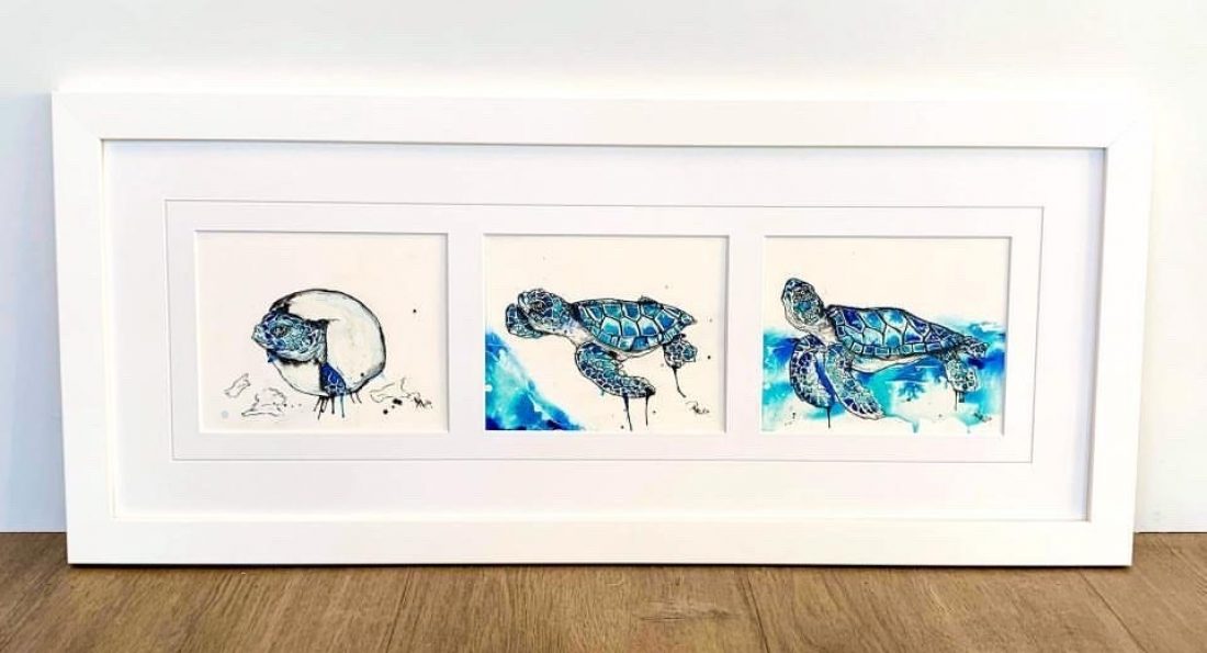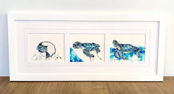 Framed in a contemporary white frame under glass and ready to hang. 3 Individual artworks frames as one piece tell the story of a turtle entering the world.