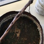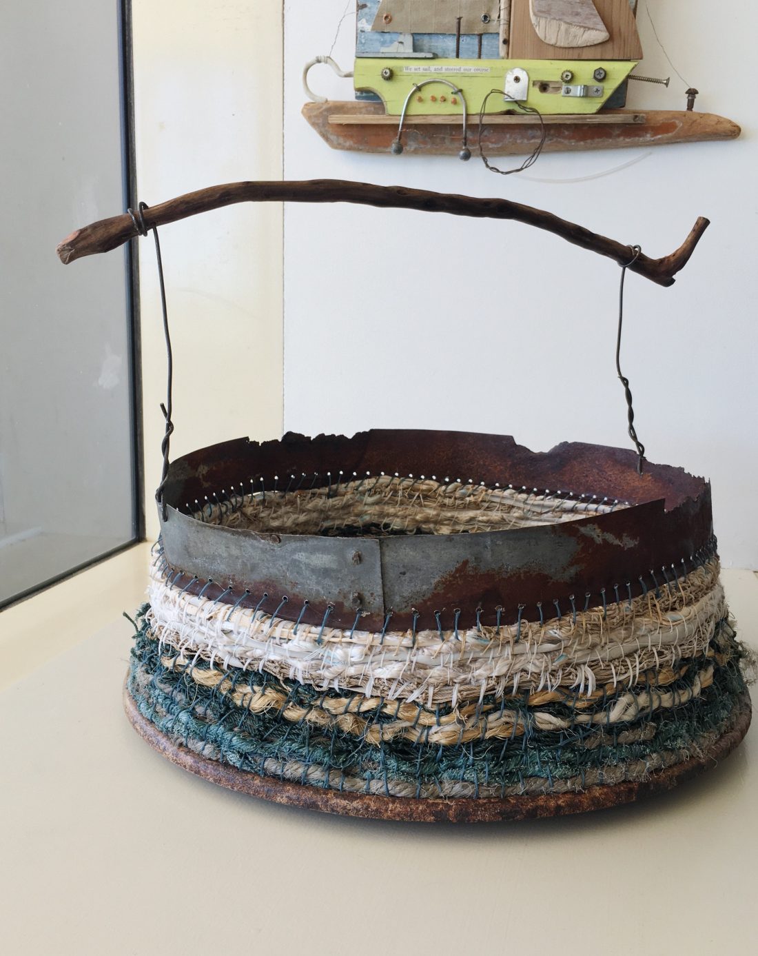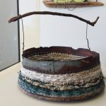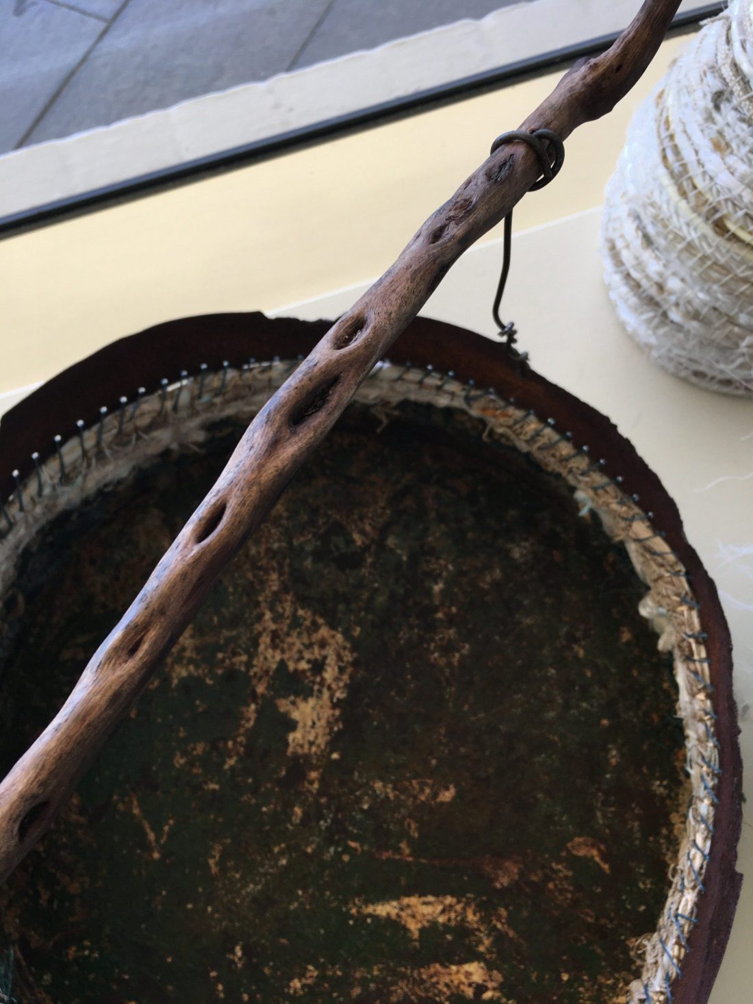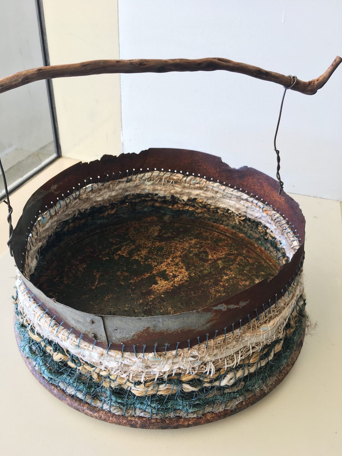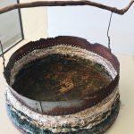 The artist has repurposed a piece of wood from the most recent bushfires. This piece was found at Wyee and brought together to create this one of a kind basket.
