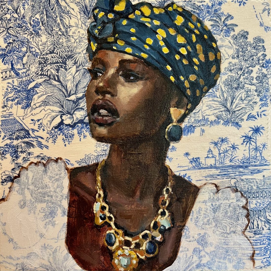 The exhibition at KAB Gallery Sydney Pineapple Safari will include a series of stunning works created on various fabrics including African ‘toile de jouy’ fabric, featuring tigers, elephants, and other striking elements that evoke an added sense of adventure. This set of works (Including this piece) combine her passion for harmonious colours and patterns with her unique take on vintage interior styles, making them perfect for those who appreciate popular 20th-century interior design.