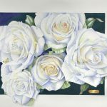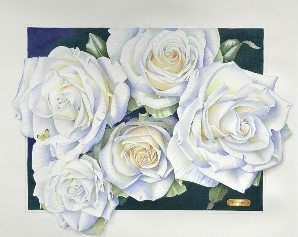 The name of this piece refers to the small, yellow butterfly resting on one of the rose petals.