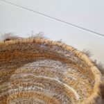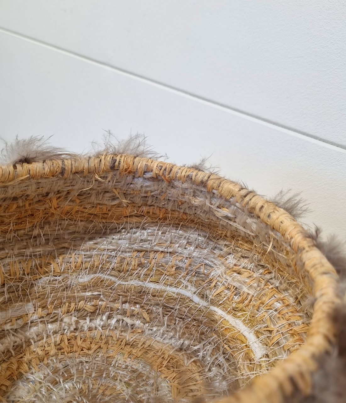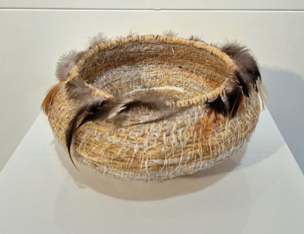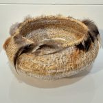 A woven basket by Nicole De Mestre, comprised of baling twine, rope, nets, string, fabric, cotton, rooster feathers, raffia, jute, and flax.