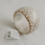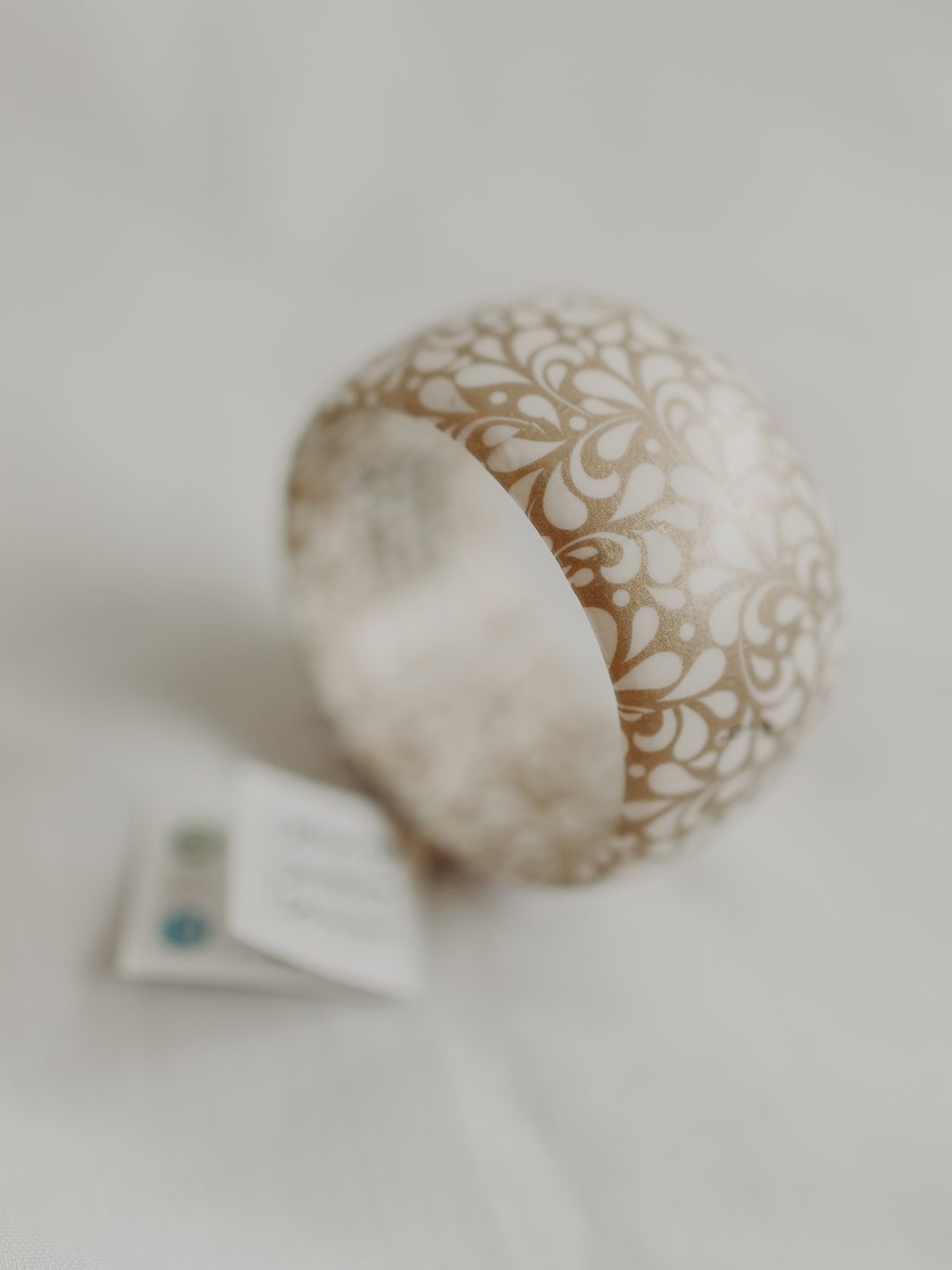 A handcrafted bangle made out of wood from sustainable sources and decorated with beautiful designs using the traditional 18th century art of decoupage.