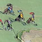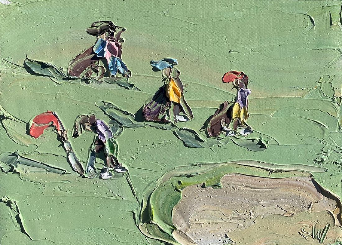 Painted on location en plein air at the Mona Vale Golf Course. A 90 year old golf course positioned just behind the beach. Sally was drawn to the location because of the club’s expansive grounds. The location was actually once a swampy marshlands and sand dunes but now has a beautiful and paint-worthy sprawling green golf course.