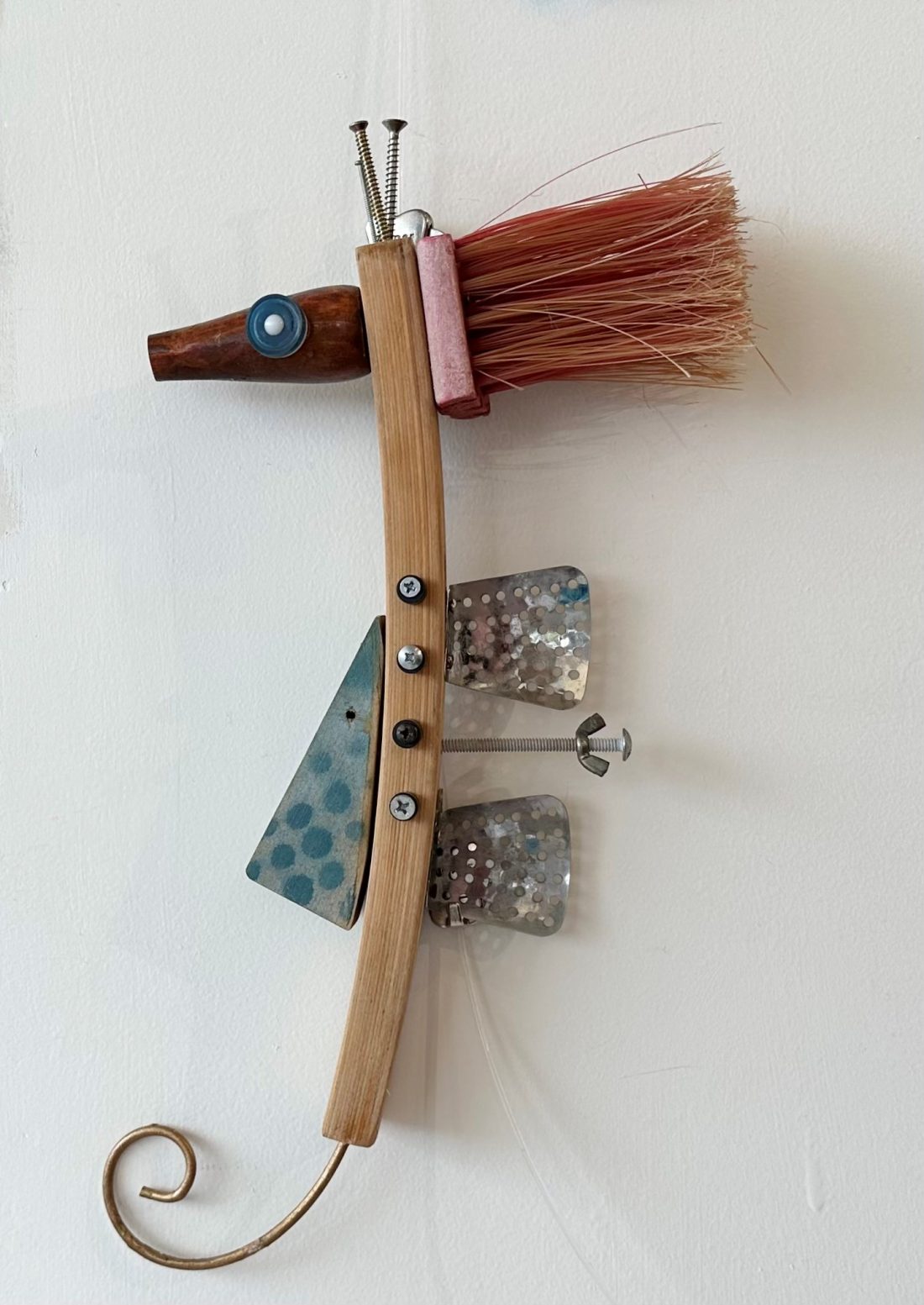 A sculptured hanging piece by Nicole de Mestre. Hand crafted from recycled and found materials