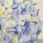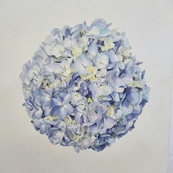 Original watercolour painting from Belinda’s popular Hydrangea set. Belinda has meticulously captured the delicate petals of the hydrangea flower. It comes to life with a beautiful unique blend of green, blue, and purple tones. The varying shades suggest a fascinating interplay, reminiscent of the flower’s response to the pH levels of the soil it thrives in. The artist’s attention to detail captures the subtle gradations of color and textural imperfections, conveying the intricate beauty of this enchanting bloom.