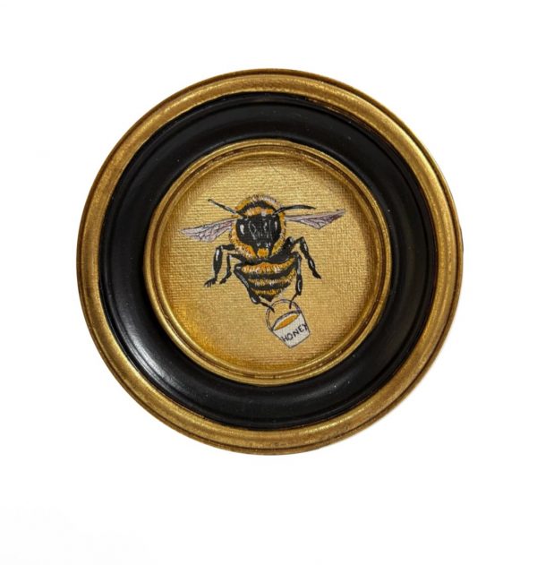 Round artwork presented in an ornate style round frame. The artwork is suitable to stand on a shelf or be hung on the wall.