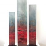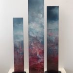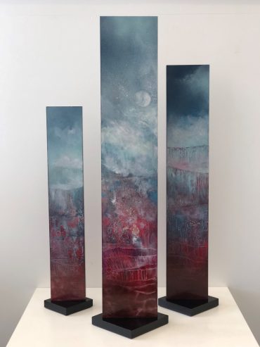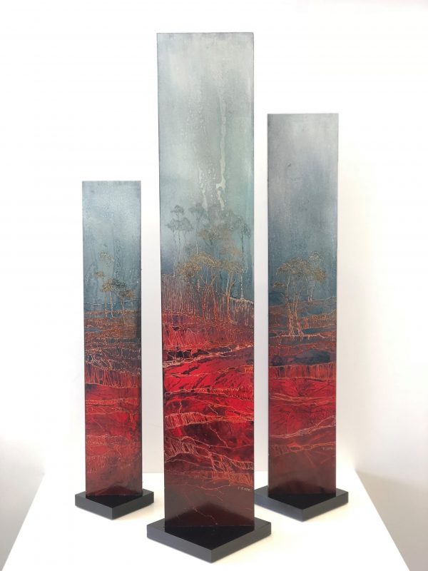 Featuring paintings on both sides, this standing artwork is made up of three parts and is incredibly full of interest and detail. Drawing the viewer in, you are able to see the landscape and the moody, vibrant colours dance on the wood. A true statement piece by Australian artist Penelope Oates.