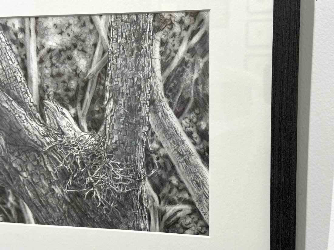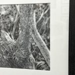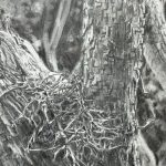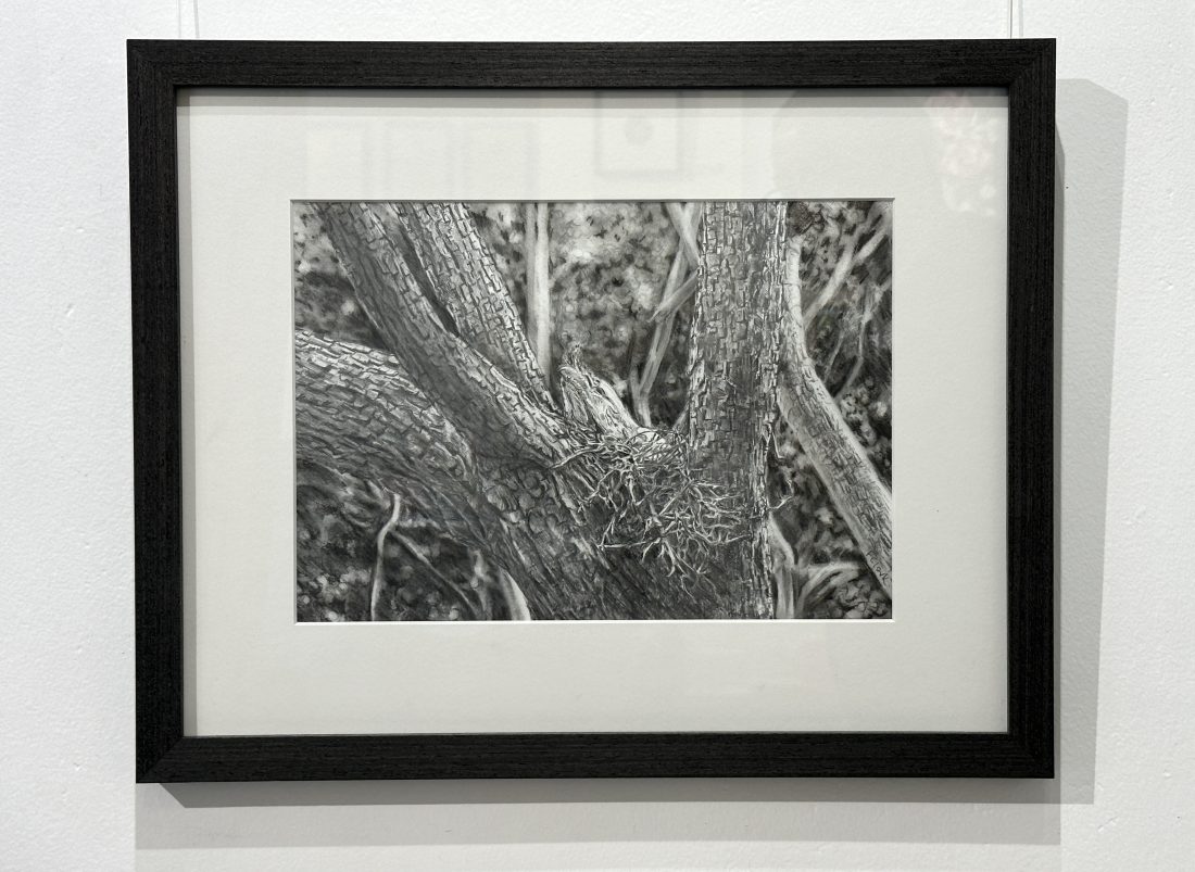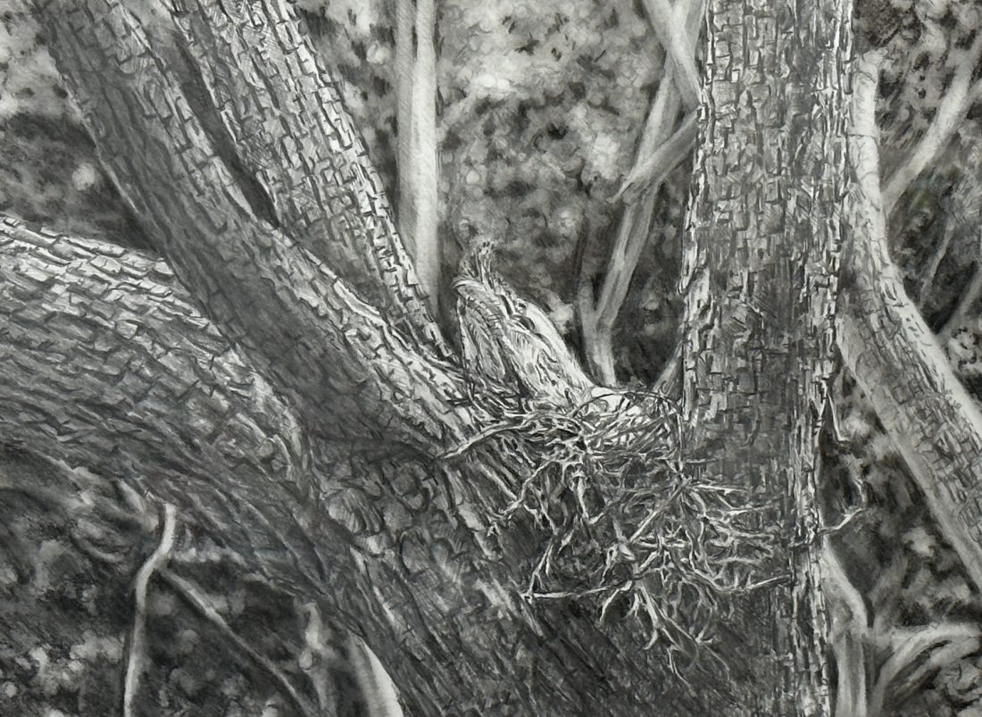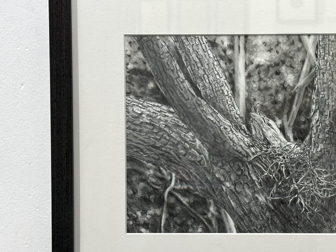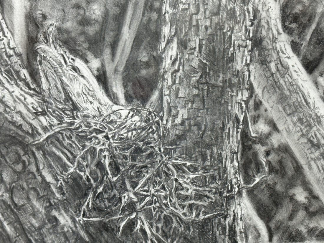 The Tawny Frogmouth is a remarkable and unique native bird, known for its cryptic camouflage and distinctive appearance. Their ability to blend seamlessly into the tree branches is a key aspect of their behaviour, making them truly master of disguise in the avian world. Despite their adeptness at camouflage, their nest building habit take a rather pragmatic and simple approach when it comes to constructing a nest to nurture their young. This Pencil and Charcoal captures my first encounter with this ‘Master of Disguise’ (for the Ku-ring-gai Art Festival)