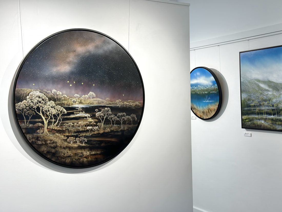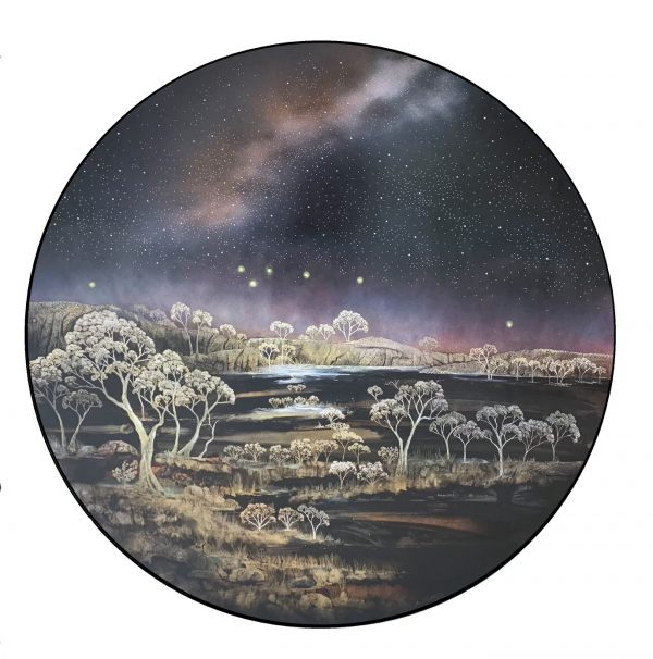 “Last year I travelled and spent time sketching and photographing outback NSW for an exhibition this year. The expanse of the desert with its red earth and unending sky was just as alluring in the daytime as it was at night. I was able to spend an evening at the Broken Hill Astronomy looking through a high-powered telescope at the Milky Way, from this experience I became fascinated with stories of Min Min lights. Reported in several outback regions, they appear after dark and are described as fuzzy disks or glowing orbs that changed in size, brightness, colouration and they seem to hover silently above the horizon.