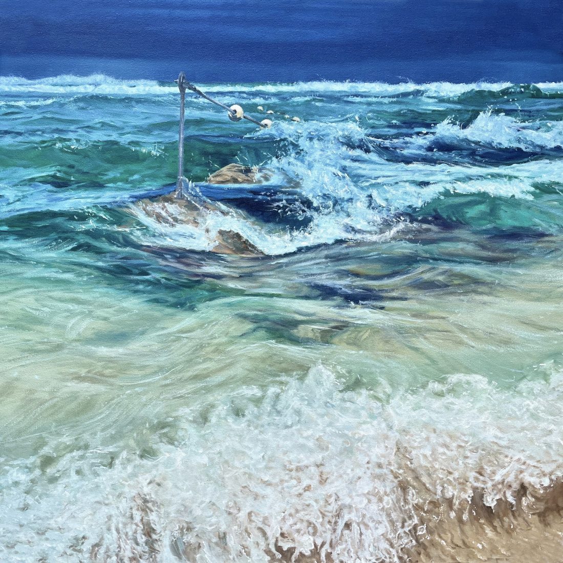 “Looking into a rock pool, you are greeted by a captivating world where the water gently ripples and swirls. The surface glistens under the sun, reflecting a mosaic of colours—deep blues, vibrant greens, and hints of gold. When I approached a young woman, and explained that I’m an artist focused on capturing water and movement, I asked if I could document her dive for inspiration. I was mesmerized by how the water transformed her form and the rock pool beneath, creating a fluid connection between the two subjects.” explains Fiona Clark