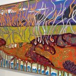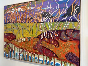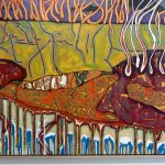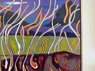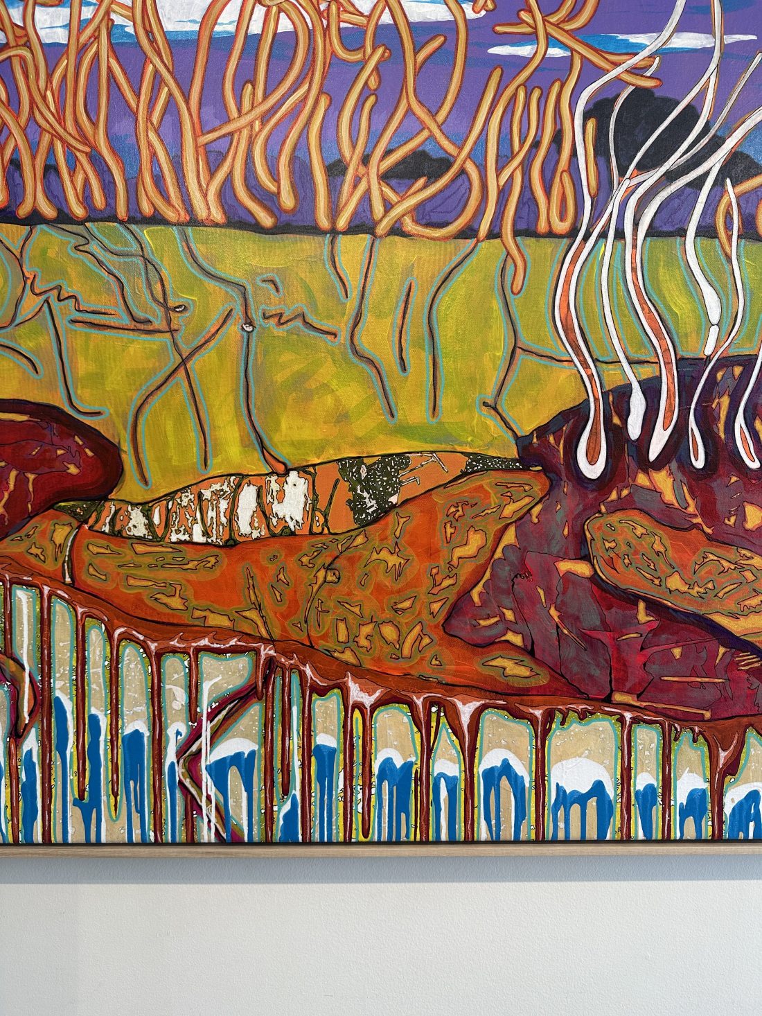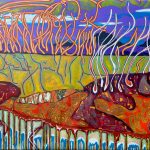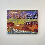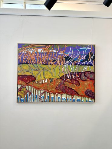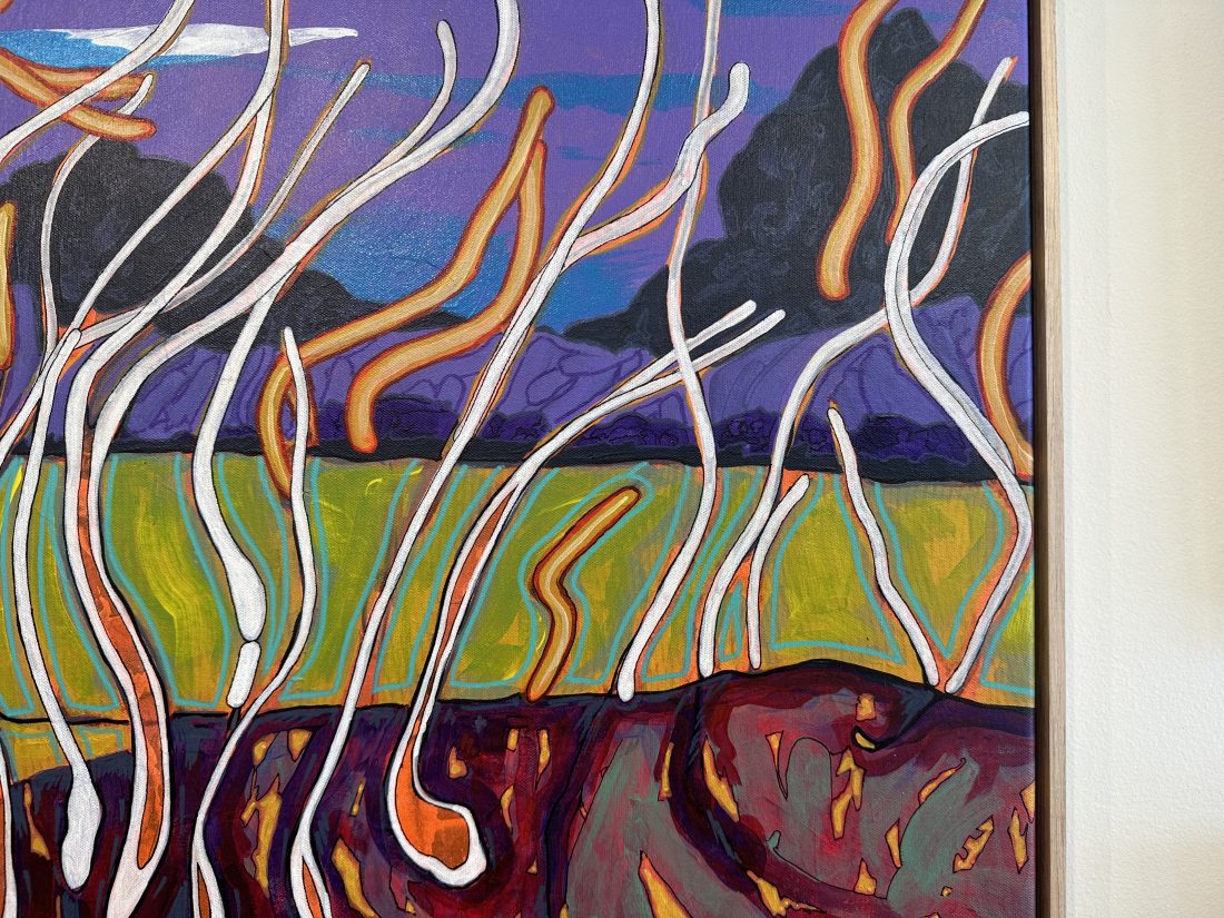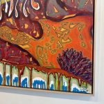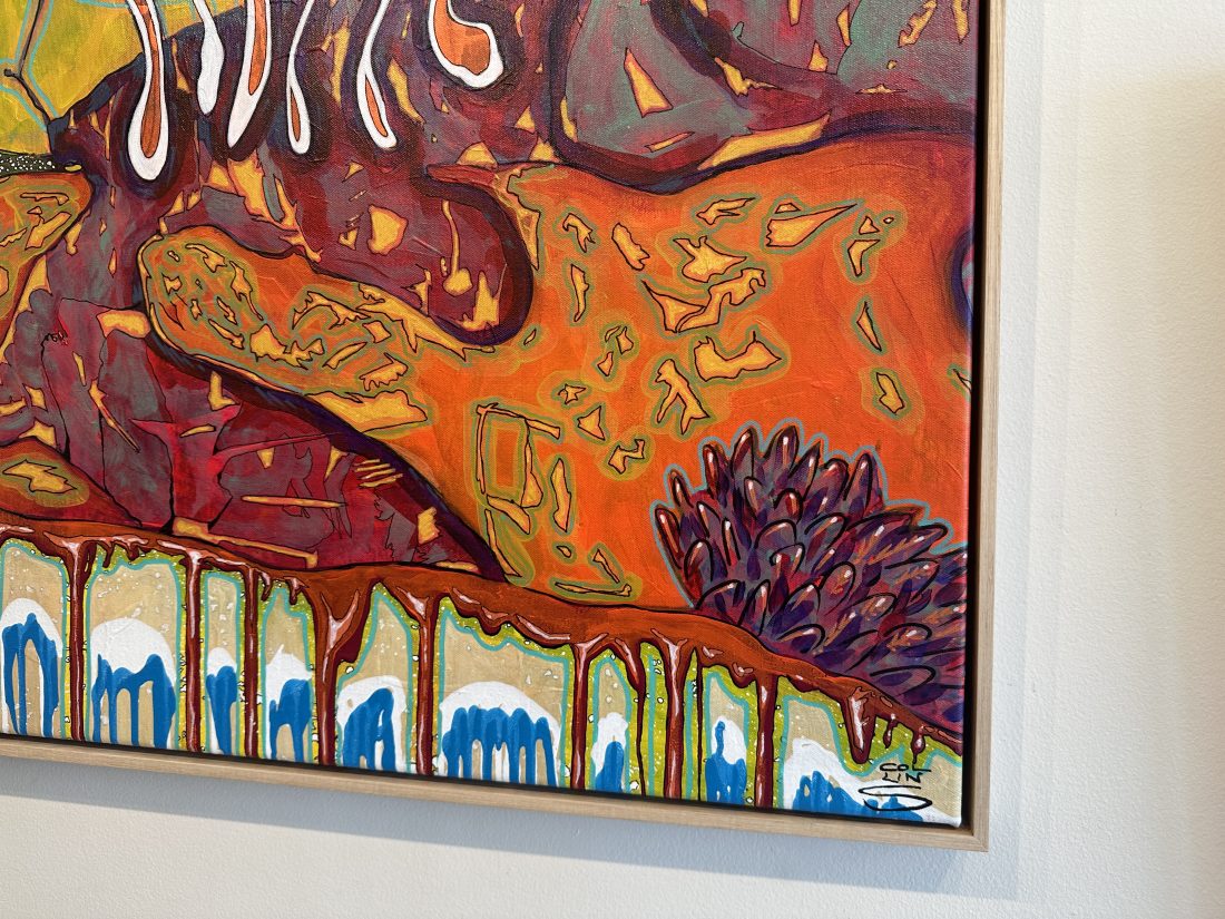 This painting channels the organic shapes and saturated hues of the coast. Working in acrylic allows him to build depth and texture quickly, creating compositions that balance spontaneity with refined detail.
