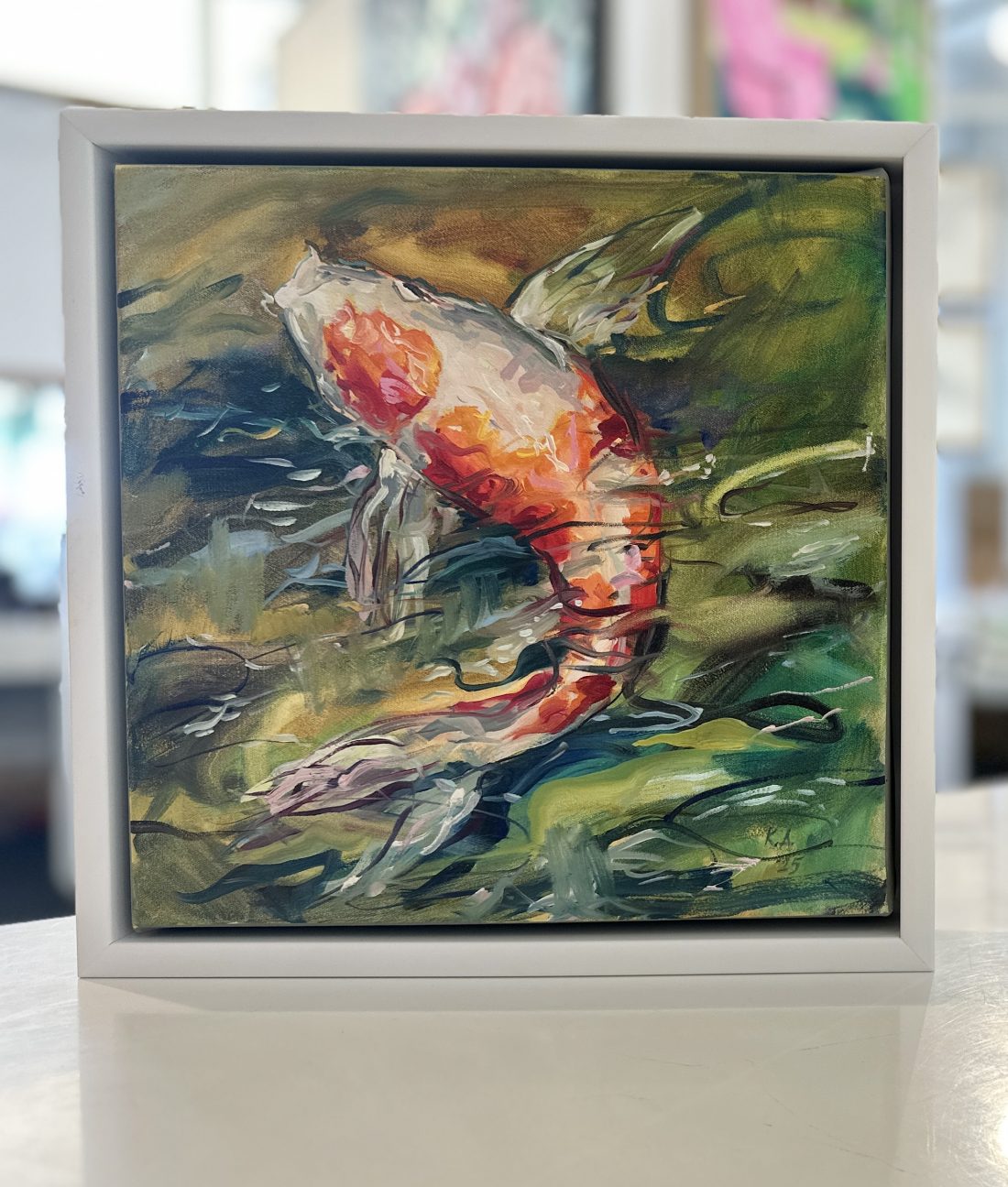 Framed in a contemporary white trim frame, measuring 29x29cm.