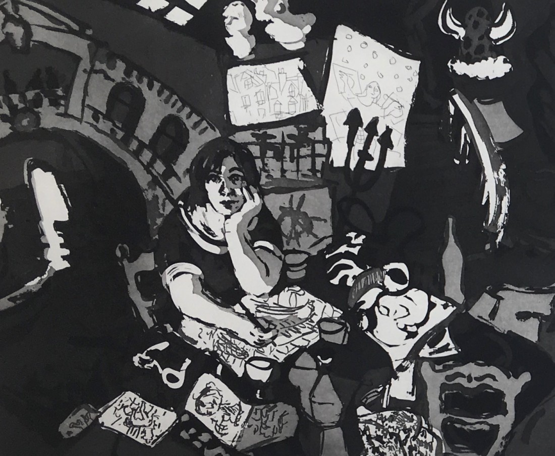 Original Aquatint Etching on paper, signed and titled in graphite by the artist. As the title suggests this image is created in Wendy Sharpe’s studio with her Venice Painting in the background. Framed and ready to display in your space (under perspex)