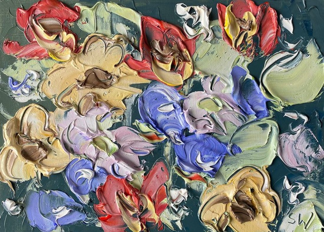 A textured floral study by Australian Artist, Sally West. Painted from life in her studio.