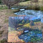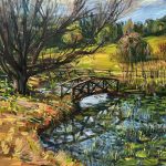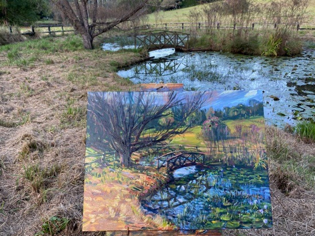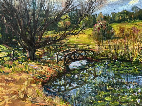 I was drawn to make paintings of Bangaloe, (Pickett’s Valley, Central Coast) since I was generally attracted to the beauty and solitude of the landscape. In particular, I was taken by the lily pond and Japanese bridge, not least because it evoked memories and similarities with Monet’s wonderful garden, which he created at Giverny in France and which too famously features hilly ponds and green Japanese bridge – a huge inspiration for his paintings in his later years and which reflect his love of Japanese art. It was impossible not to think of his work when looking out over the tranquil surfaces of the lily pond here at Bangaloe with it’s own curved bridge. Furthermore, as I painted the view several times, I noticed the linear qualities of the trees around the pond, whose branches scribble out against the blue sky. I could equate therm with the sinuous lines of Japanese prints, which also fascinated Monet and which feature on many of the walls in his house at Giverny. I have visited his house and gardens on several occasions and one particular highlight is his kitchen, with beautiful copper pots and pans against the blue and white tiles. I can imagine him and his wife having family get togethers here, and probably no more so than on Christmas Eve.