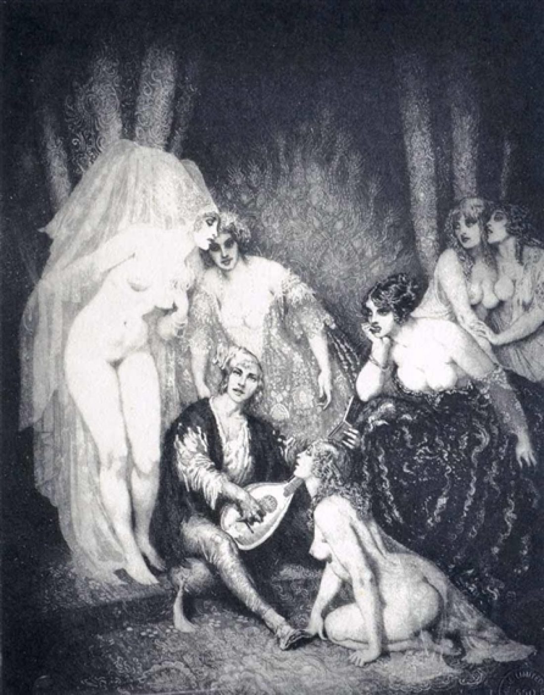 The Ragged Poet is an exquisite etching. The central figure of the poet is the focus of attention as the audience is mesmerised by his song. The needling of the veil on the nude figure and the complicated fabric of the curtain, carpet and gowns display a mastery of etching technique.s.