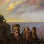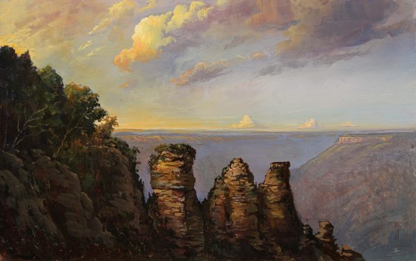 Painted on location in Australia. Framed in contemporary black frame with a gold trim.