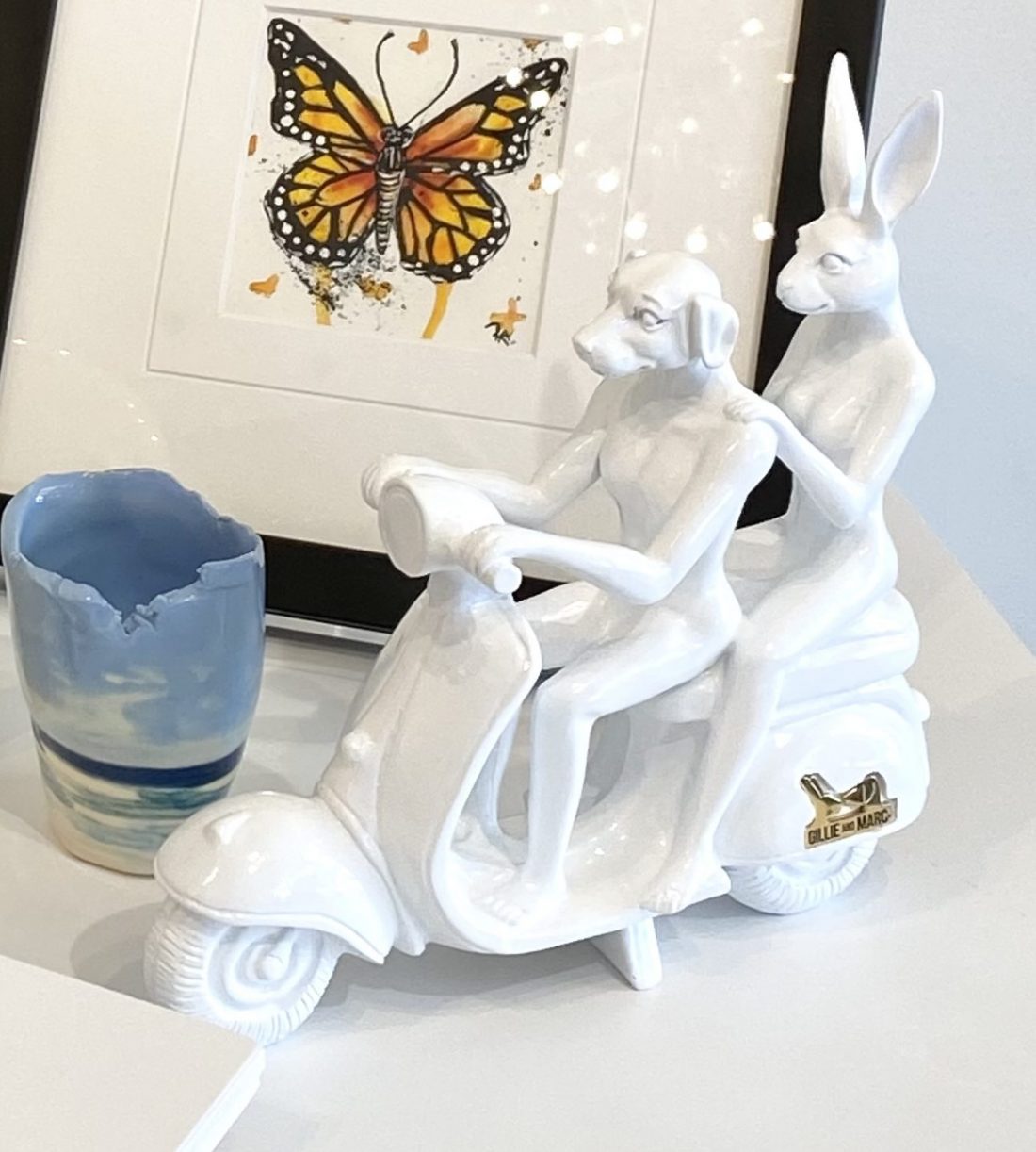 This miniature sculpture is modelled off one of Gillie and Marc’s most iconic pieces of work, featuring Dogman and Rabbitwoman riding a Vespa. When Gillie and Marc first met, they chose this mode of transportation to create magical new experiences with one another. Since that day, the Vespa has conjured some of their favourite memories! This sculpture expresses the sense of happiness that comes from falling in love. In these moments, we care little about the destination because we’re so bewildered by every second of the journey. This colourful polyresin makes an attractive statement piece that will invigorate any room, bringing joy and brightness.