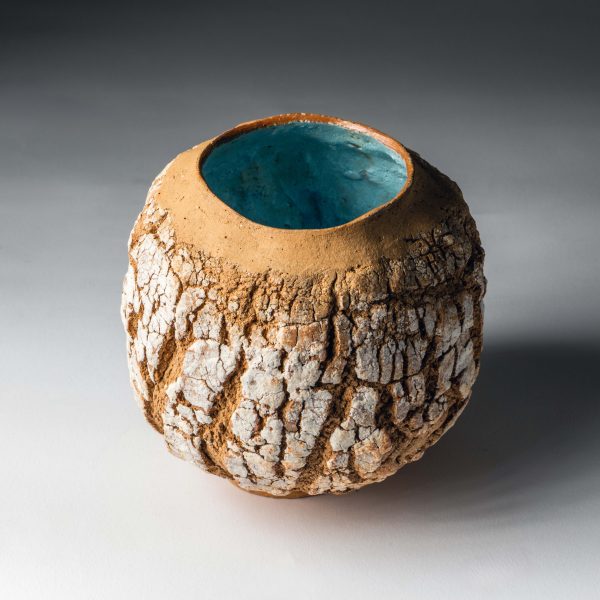 A nature inspired ceramic piece with a textured surface, coated with a home made organic glaze.