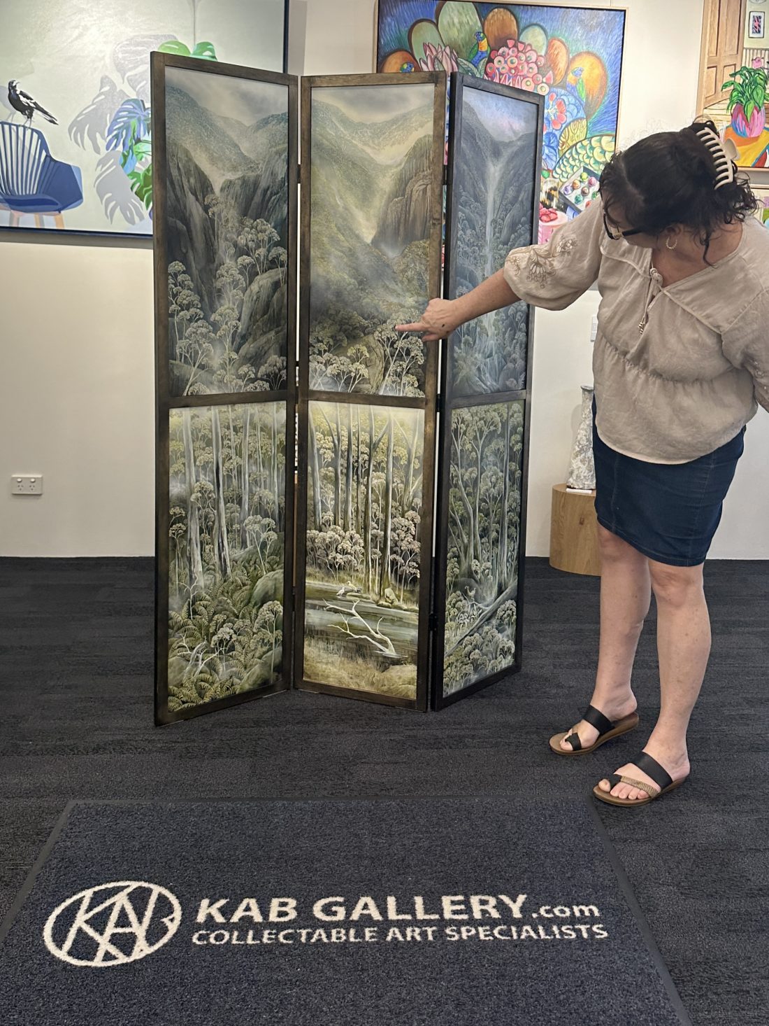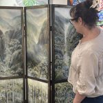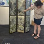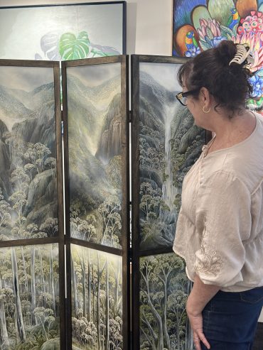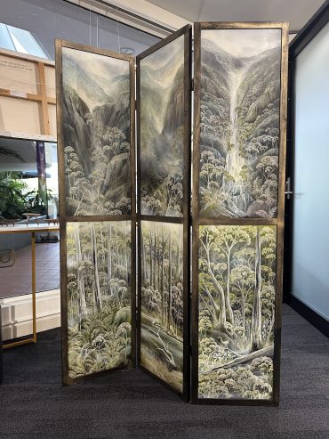 Unfolding Views by Penelope Oates is a six panel folding screen made up of six original artworks, designed to be experienced both as individual scenes and as one continuous landscape.