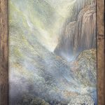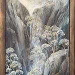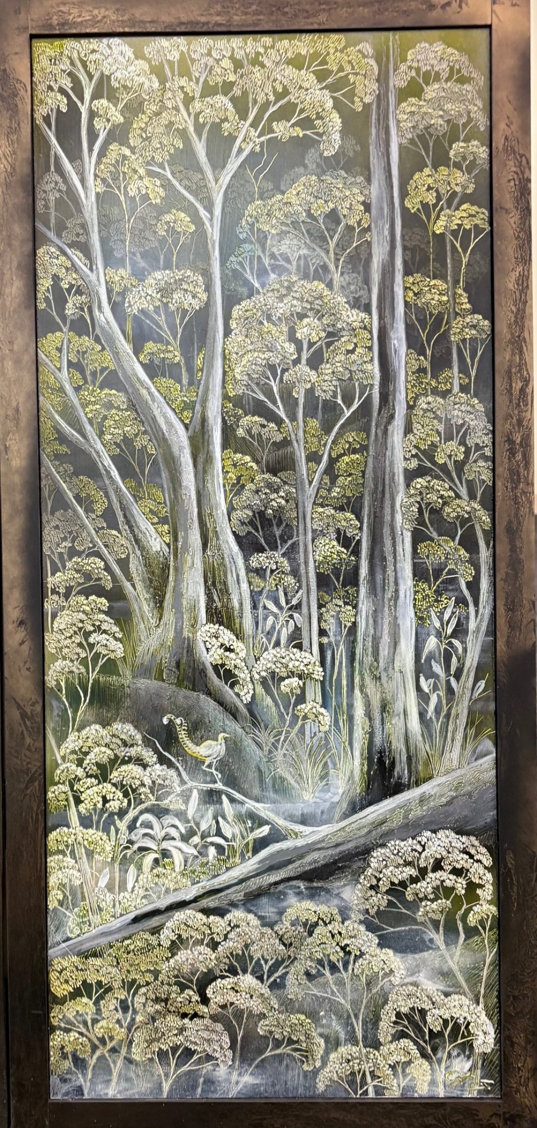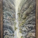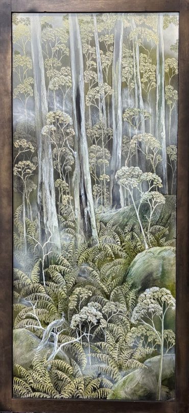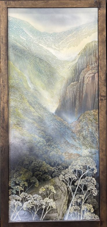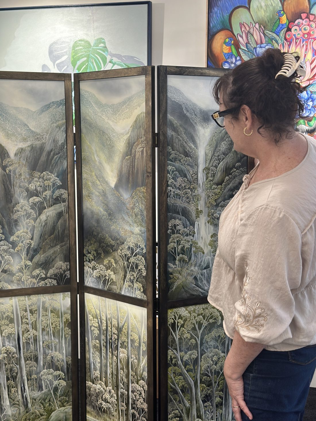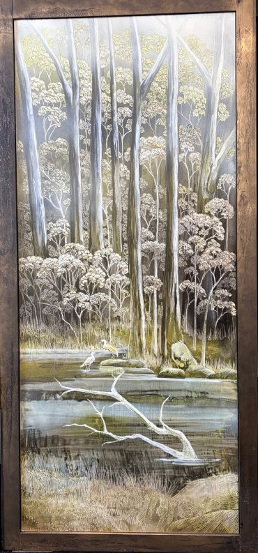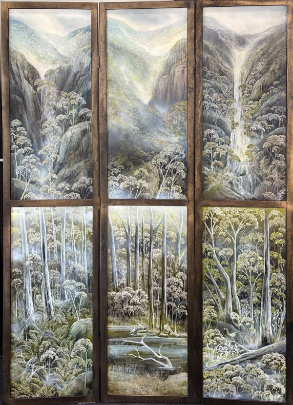The composition moves from mountains and cascading water at the top through to dense Australian bushland below, creating a clear sense of depth and progression. The landscape is directly inspired by the Dharug Country (NSW), with Oates referencing its rugged terrain, native vegetation and wildlife. Look closely to see the native Australian Lyrebird and waterbirds.