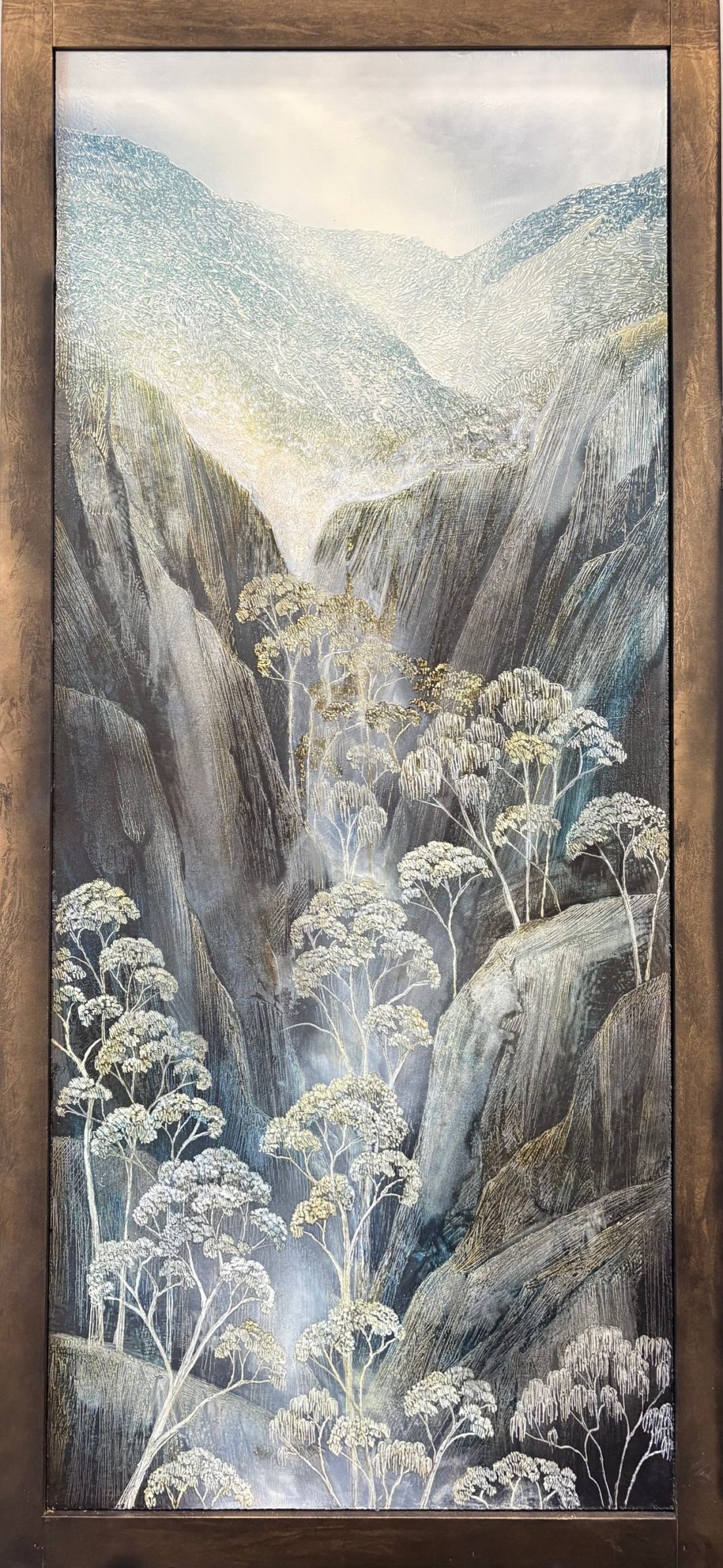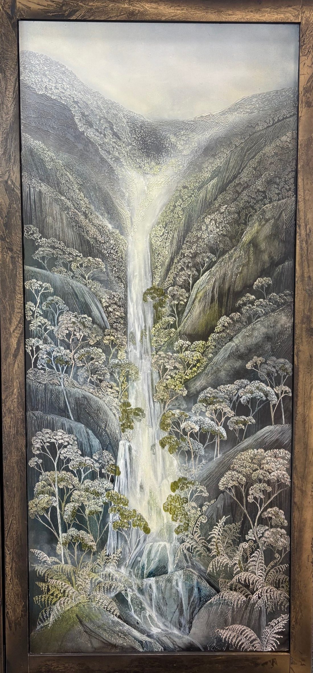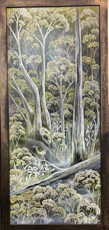 Her mixed media technique allows for fine etched detail alongside softer, atmospheric misty touches, giving the work both structure and subtle movement. Each panel connects naturally to the next, while still holding its own as a resolved artwork.
