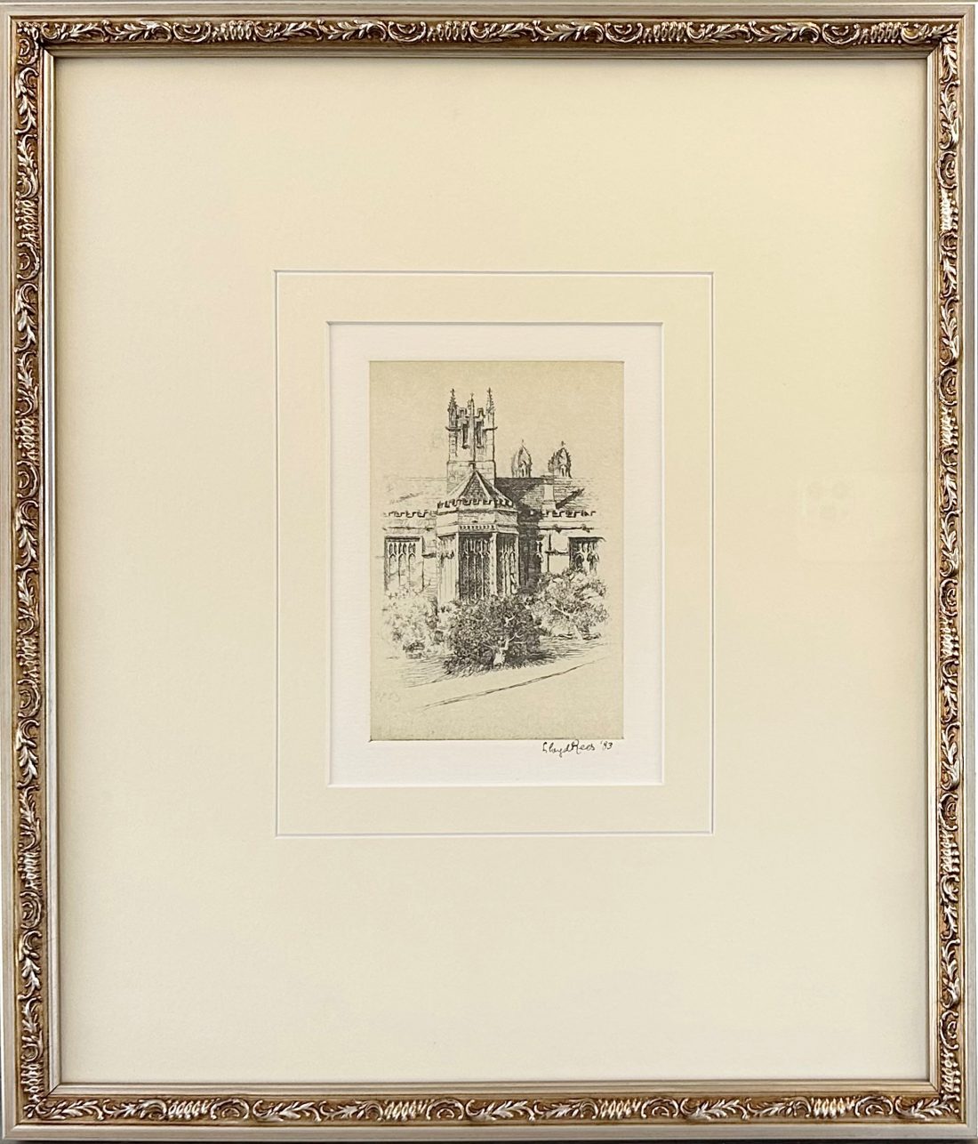 Original etching presented in elegant decorative frame (gold with glass, size 43x38cm)