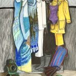 Fewtrell-Gobert opens the door to a wardrobe that tells tales of adventure and duty. This painting features a diverse collection of aquatic and naval attire, including a swimsuit, flippers, snorkel, diving gear, a Navy Marine uniform, and a vibrant yellow raincoat. The assortment of items suggests a life lived both under the sea and in service, blending the playful with the professional. The yellow raincoat adds a splash of colour too, hinting at the wearer’s readiness to brave any storm, whether literal or metaphorical.